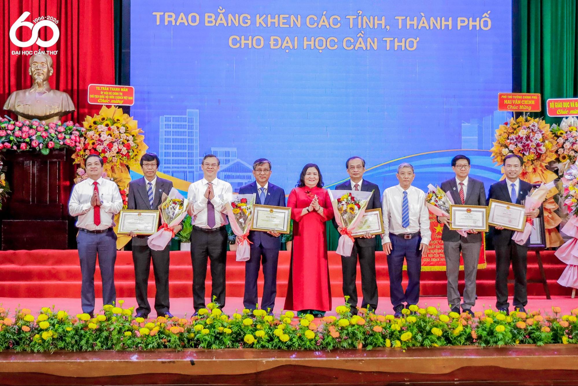 Representatives of the People’s Committee of Can Tho City and the provinces of An Giang, Ca Mau, Dong Thap, and Vinh Long presented Certificates of Merit to CTU for its contributions to the development of human resources, scientific research, and technology transfer in the region