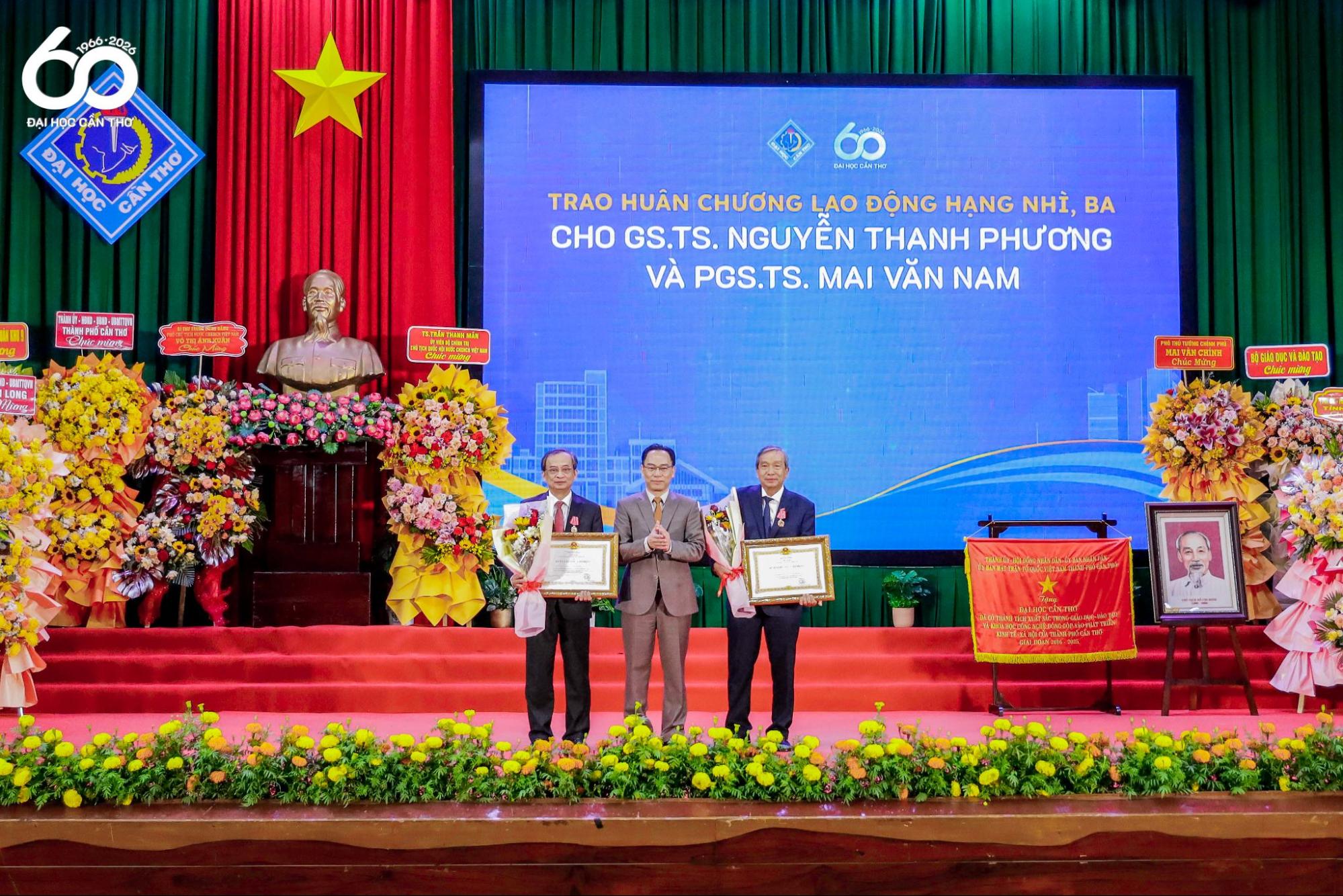 A representative of the Ministry of Education and Training announced the decision of the State President to award the Second-Class Labor Order to Prof. Dr. Nguyen Thanh Phuong (left) and the Third-Class Labor Order to Assoc. Prof. Dr. Mai Van Nam (right)